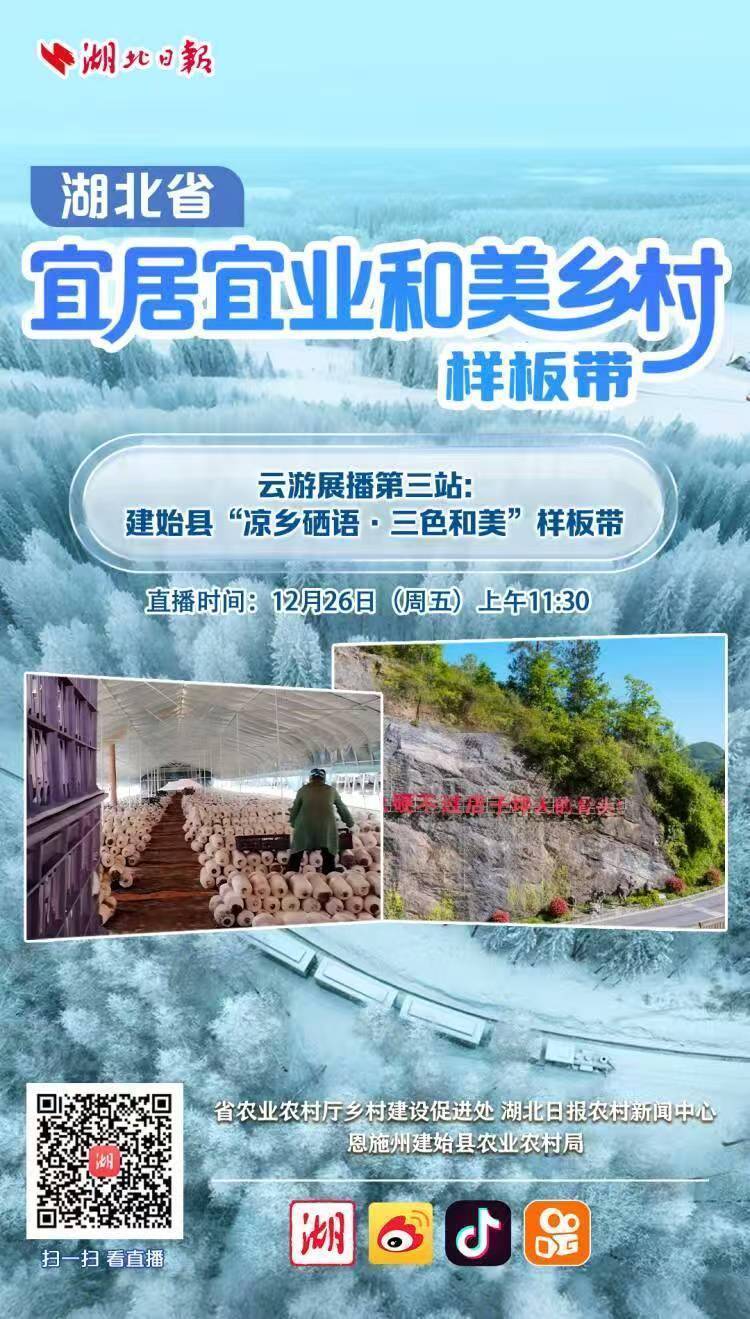 12月26日上昼11:30,湖北省宜居宜业和好意思乡村样板带云游直播第三站镜头瞄准建始县龙坪乡“凉乡硒语·三色和好意思”样板带。