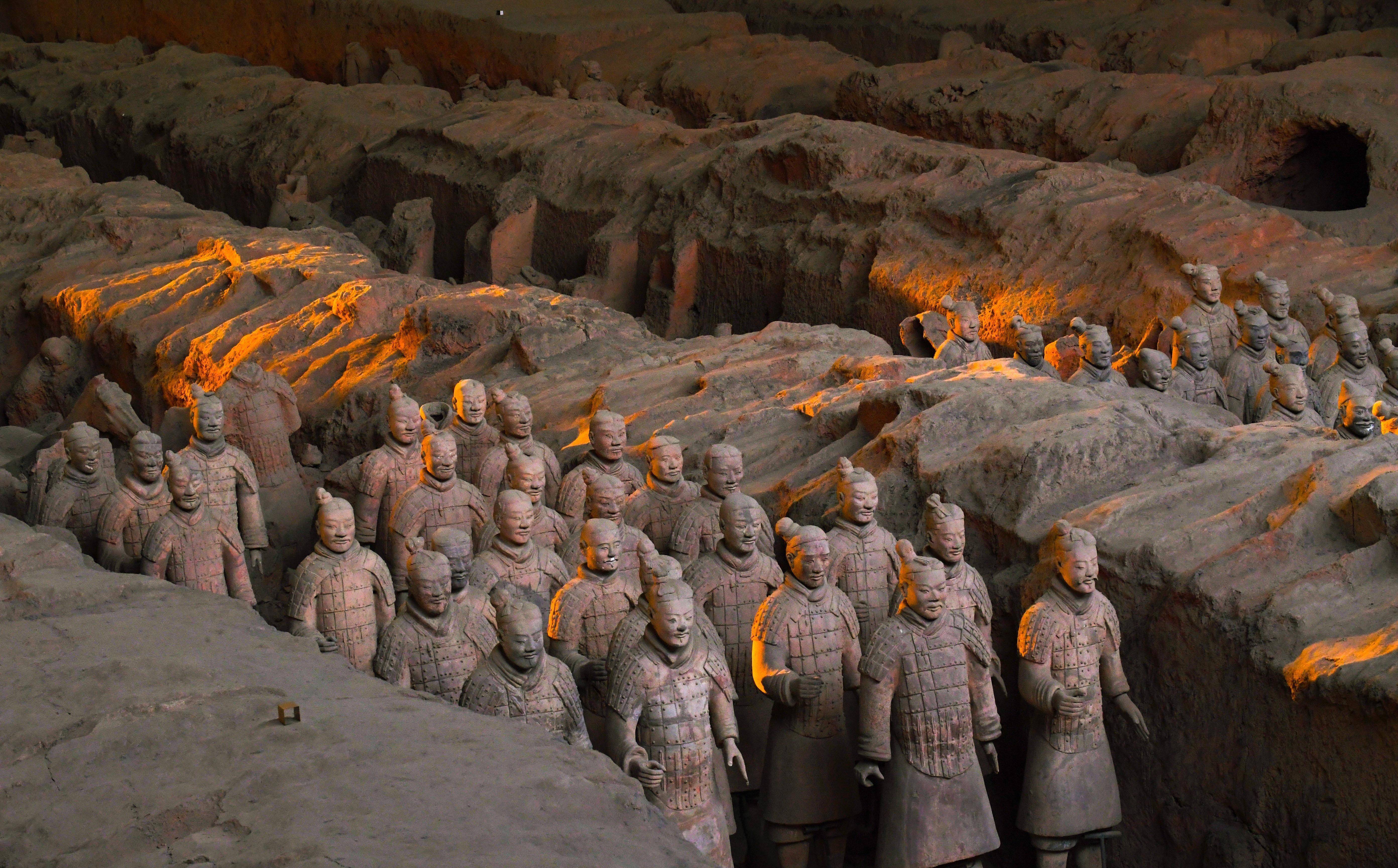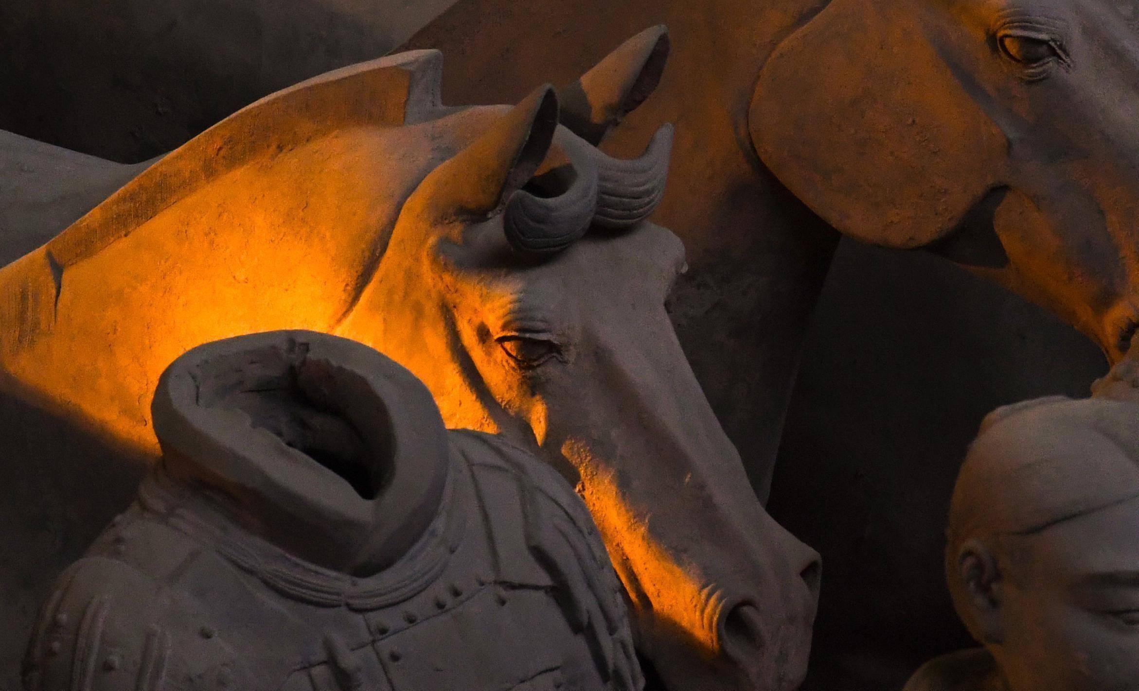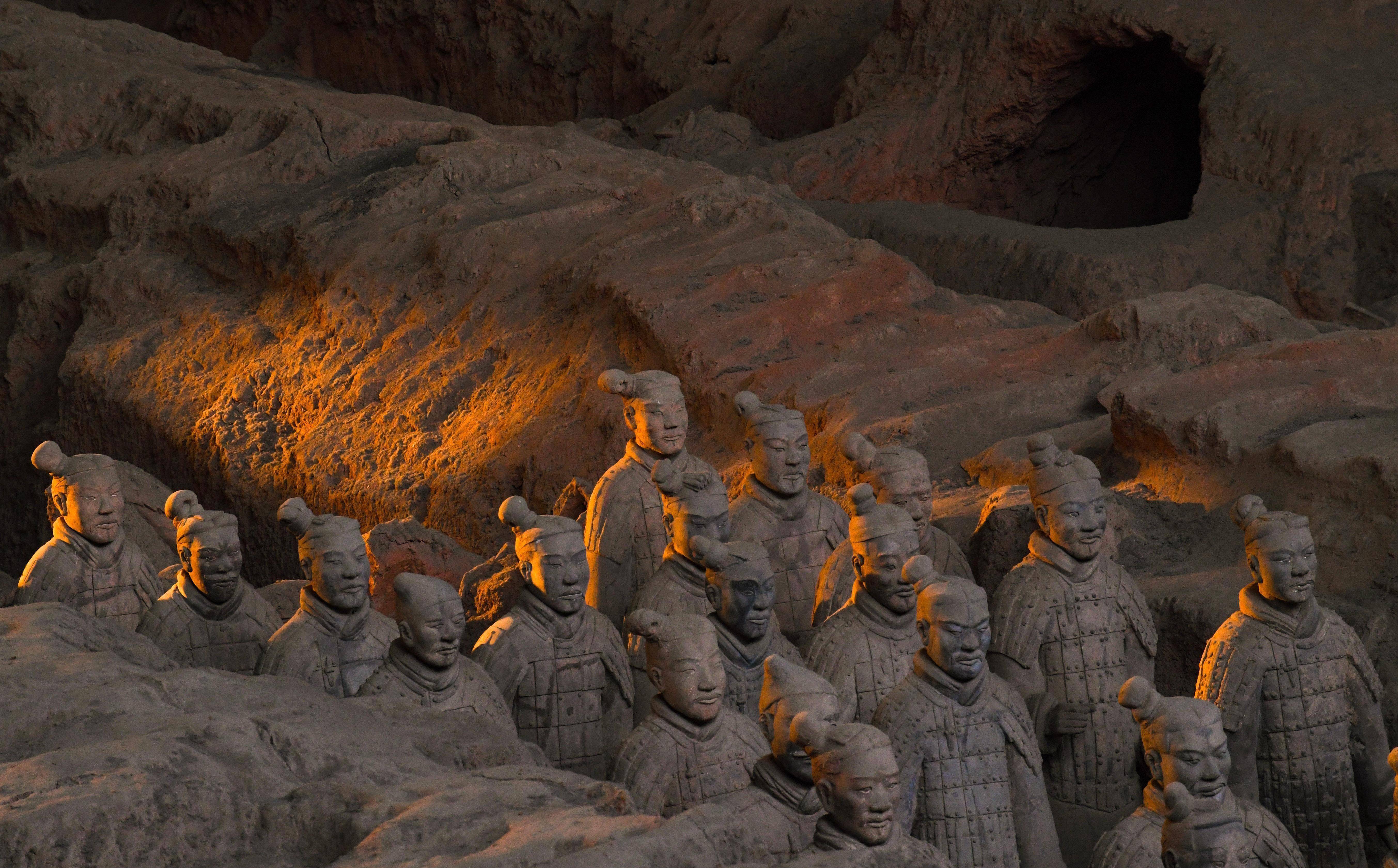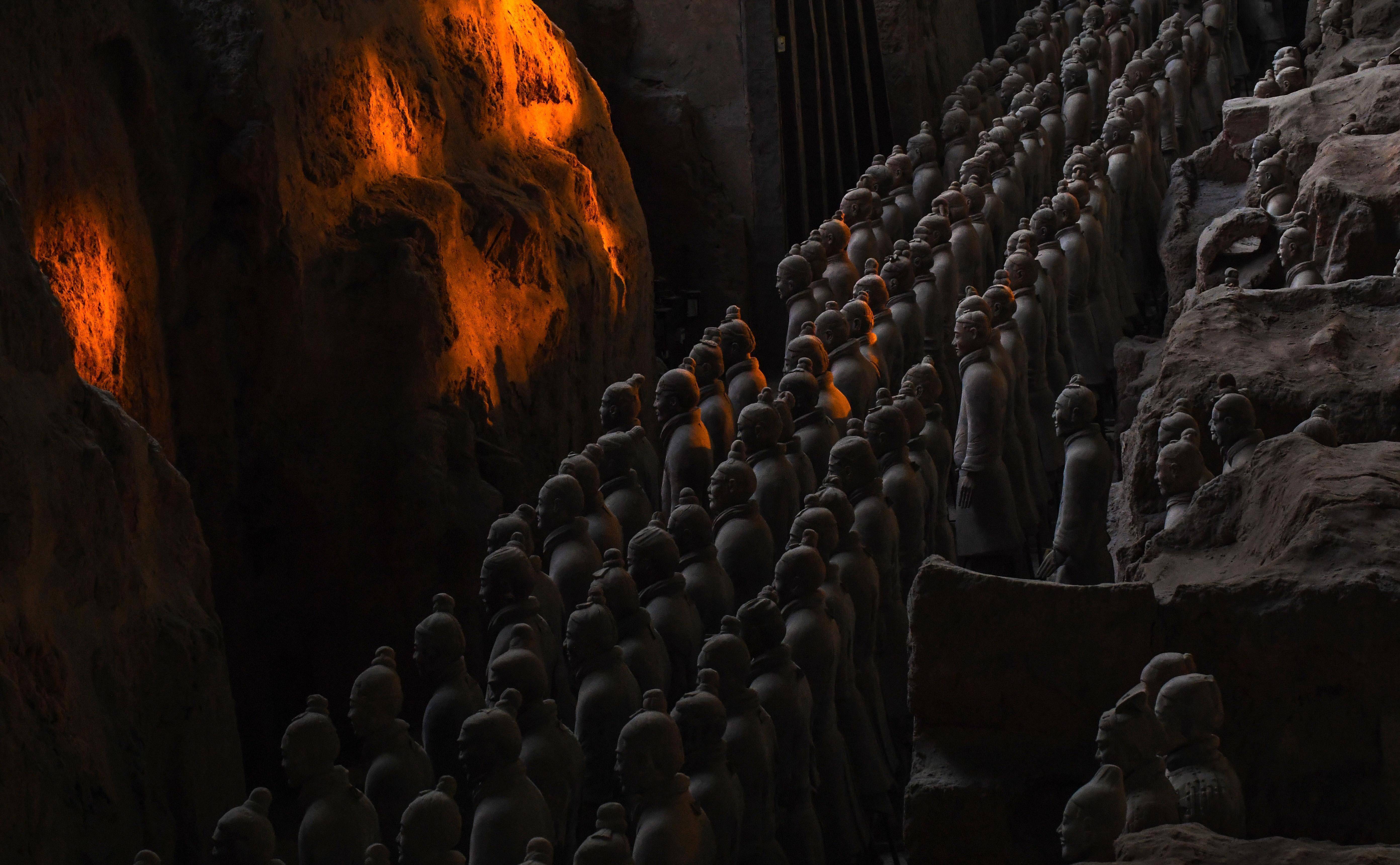 12月21日,阳光透过秦始天子陵博物院一号俑坑南侧的窗户,冉冉洒入坑内,金色的光束照耀在这些静默的戎马俑身上,光与影交汇,光芒在陶俑之间流淌,犹如历史的回响,震憾东谈主心。